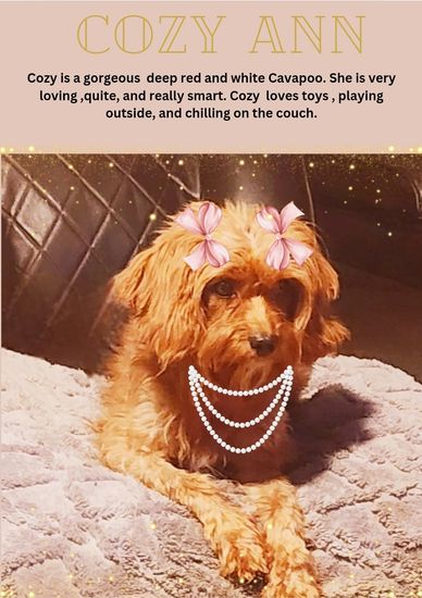 Our Cavapoos are F1b and going to be around 10 to 15 pounds. Mom is Cozy our beautiful Red Cavapoo and Dad is Dutton our Red Toy Poodle. These babies are $2200 . Will come with health guarantee and vet visit. Contact us to ask any questions and to place your deposit.